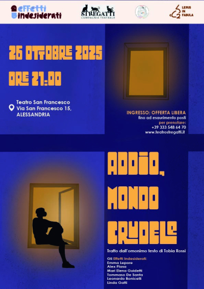 Tratta dall’omonimo testo di Tobia Rossi, Addio, mondo crudele è una commedia che racconta la storia di sei personaggi, che però non si ritrovano per strada, in un locale o sul posto di lavoro, bensì sul cornicione del tredicesimo piano di un palazzo.